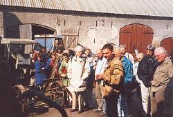 Die Kurzexkursion führte zunächst zum Hof von Jörn Haase, der die großflächige Landschaftspflege im Gebiet durchführt. Hier wurden verschiedene Arbeitsgeräte zur Landschaftspflege vorgestellt. Als Oldtimer waren ein Lanz-Bulldog von 1936 und ein Krupp Grasmäher mit Messerbalken von 1938 vertreten. Die derzeit vor allem eingesetzte Technik zur Mahd besteht aus einem Traktor Zetor mit spezieller Terra-Bereifung (hinten 1,15 m, vorn 0,90 m Reifenbreite zur Minimierung des Bodendrucks) und einem Tellermähwerk (3,10 m Arbeitsbreite) mit Wildschutz und Sensorabtastung. Bei schwierigen Verhältnissen, vor allem bei zu erwartender Fremdkörpereinwirkung auf das Mähwerk, kann ein robuster Rotormulcher (3 m Arbeitsbreite) eingesetzt werden. Außerdem wurden ein Heuwender (6 m Arbeitsbreite), ein Schwader (um das Heu auf Schwad [in Reihe] zu legen), eine Rundballenpresse mit Zwillingsbereifung und ein Sammelwagen gezeigt. Anhand der Arbeitsgeräte berichtete J. Haase anschaulich über die praktischen Schwierigkeiten bei der Mahd auf Niedermoorstandorten, insbesondere bei der Initialpflege nach längerer Brache. Er wies zudem auf die hohen Investitionskosten für die Spezialgeräte hin, die eine großflächige und möglichst moorschonende Mahd erst ermöglichen.