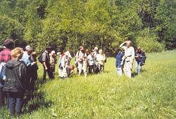 Nach der Mittagspause erläuterte N. Wedl Ergebnisse seiner „Systematischen vegetationskundlichen Untersuchungen an Transekten auf Feuchtwiesen im NSG von 1996-2000”. Einführend begründete Wedl seine Kritik gegenüber der üblichen vegetationskundlichen Methodik. Er arbeitet stattdessen grundsätzlich an Transekten mit fest eingemessenen Aufnahmeflächen, die entsprechend der konkreten Standortsituation eingerichtet werden. Die verfeinerte Schätzskala der Artmächtigkeit nach Braun-Blanquet ergänzte er um eine Kategorie „Subvitalität und fehlende Blühfähigkeit” der Individuen einer Art. Um seine Untersuchungsmethodik zu erläutern, wählte Wedl das Beispiel eines Kleinseggenrasens auf einem kuppigen Quellhorizont (40 m x 50 m). Anhand von Vegetationstabellen und schematischen Darstellungen beschrieb er die kleinräumige Abfolge von Pflanzengemeinschaften (Kohldistel-, Pfeifengras-, Kalk-Kleinseggen-Gesellschaft, Gesellschaft der Armblütigen Sumpfsimse) entlang von Gradienten entsprechend der Hydrologie, der Morphologie und des Nährstoffstatus. Des Weiteren stellte Wedl Veränderungen der Vegetation auf ehemaligen Feuchtwiesenbrachen aufgrund von Landschaftspflegemaßnahmen über einen Zeitraum von 4 Jahren dar und nannte die Erfolge. Abschließend vertrat er die Auffassung, dass seine Arbeitsmethode gut geeignet sei, um Veränderungen kurzfristig nachzuweisen, kleinstandörtliche Unterschiede abzugrenzen und Pflanzengesellschaften zu charakterisieren. Die Ergebnisse seien verifizierbar und eine Basis für zukünftiges Monitoring.